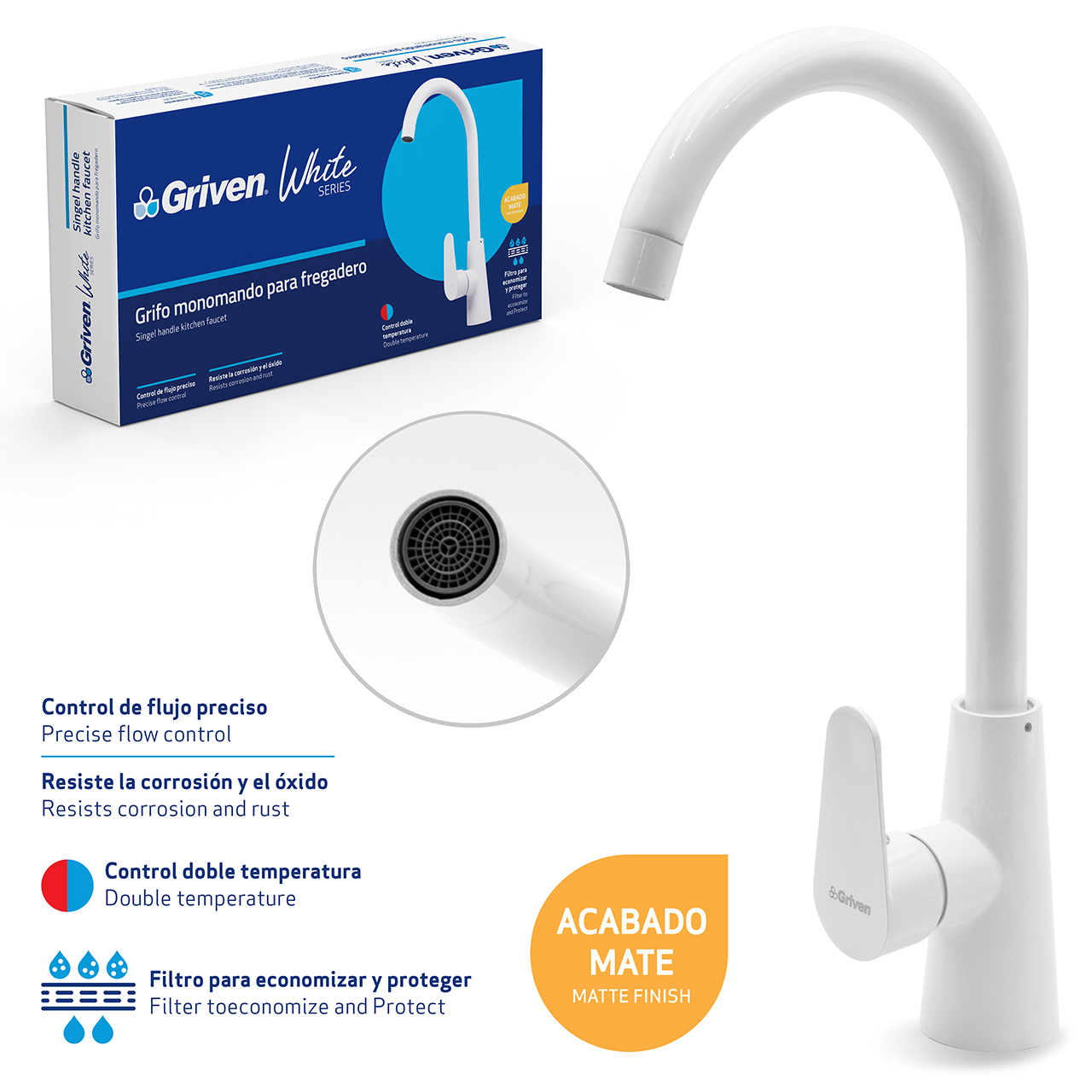 GRIFO INDIVIDUAL PARA FREGADERO CUELLO ALTO ACERO INXIDABLE ACABADO BLANCO MATE